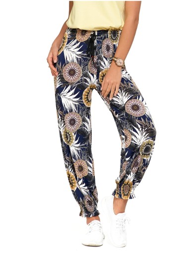 Spodnie damskie alladynki. Model ma luźny nieopinający krój, zapewniający maksimum swobody. Zwiewny delikatny materiał idealnie sprawdzi się w sezonie wiosenno-letnim. W pasie jest szeroki, elastyczny ściągacz – nie uciska i maskuje ewentualne mankamenty sylwetki. Nogawki także zakończone są ściągaczem. Spodnie w całości zdobione są przykuwającym uwagę, modnym wzorem. Tego typu luźne kroje spodni znakomicie komponują się z dopasowaną górą stylizacji.