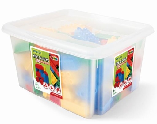 Klocki Blocks firmy Wader to zestaw 132 różnokształtnych, kolorowych elementów dopasowanych do małych rączek. Łatwość łączenia poszczególnych części ze sobą sprawia, że zabawka doskonale nadaje się dla najmłodszych dzieci. Całość zapakowana jest w poręczny plastikowy pojemnik, który pomoże uporządkować zabawki po skończonej zabawie.
