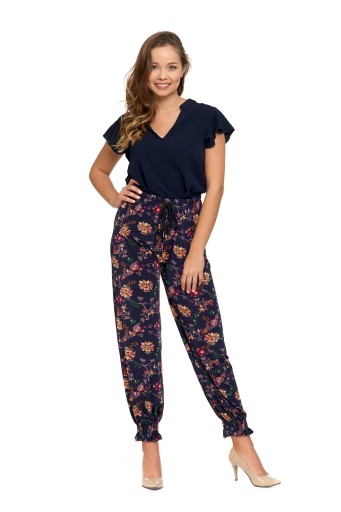 Spodnie damskie alladynki. Model ma luźny nieopinający krój, zapewniający maksimum swobody. Zwiewny delikatny materiał idealnie sprawdzi się w sezonie wiosenno-letnim. W pasie jest szeroki, elastyczny ściągacz – nie uciska i maskuje ewentualne mankamenty sylwetki. Nogawki także zakończone są ściągaczem. Spodnie w całości zdobione są przykuwającym uwagę, modnym wzorem. Tego typu luźne kroje spodni znakomicie komponują się z dopasowaną górą stylizacji.