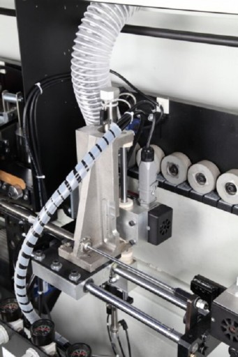 - Zbiornik na klej: pokryty teflonem zbiornik o pojemności 1,2 kg jest przeznaczony do kleju termotopliwego EVA. Klej nakłada się za pomocą regulowanego wałka klejącego.