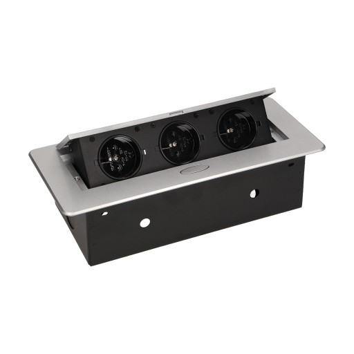 Zestaw dwóch gniazd sieciowych z uziemieniem połączonych z ładowarką USB w obudowie chowanej w blat. Przeznaczone do montażu wewnątrz pomieszczeń w biurkach, blatach i stołach, zarówno w pozycji pionowej jak i poziomej, zapewniając dostęp do gniazd elektrycznych.