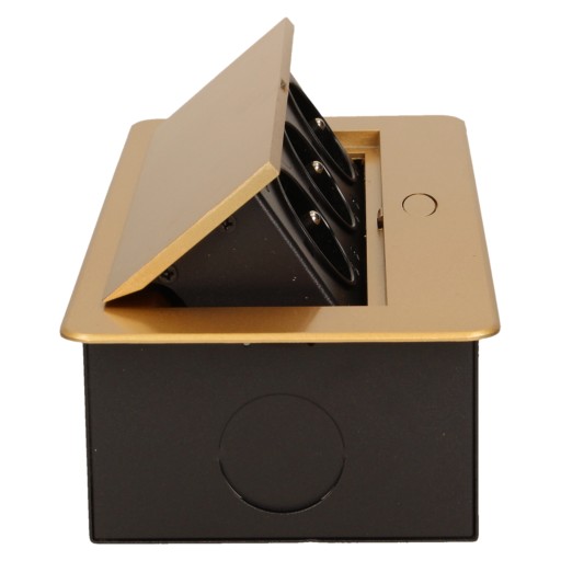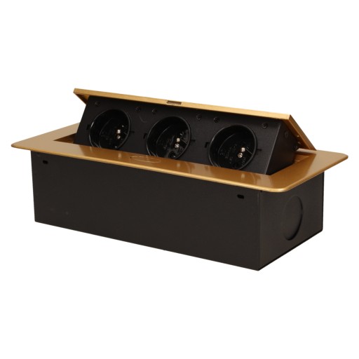Gniazda wpuszczane w blat 3x2P+Z z płaskim, frezowanym rantem, złoty