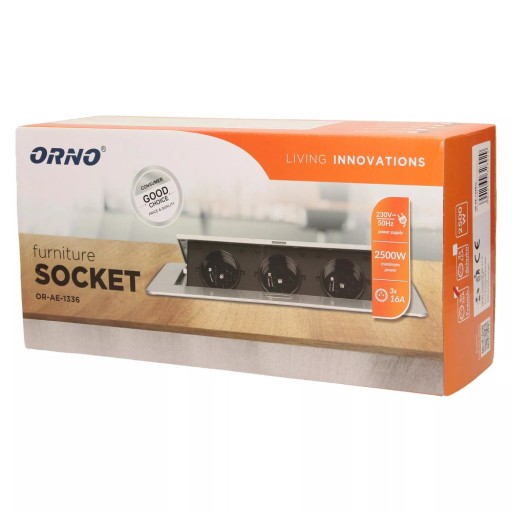 Zestaw trzech gniazd sieciowych 2P+Z z uziemieniem, w obudowie chowanej w blat. Przeznaczone do montażu wewnątrz pomieszczeń w biurkach, blatach i stołach, zarówno w pozycji pionowej jak i poziomej, zapewniając dostęp do gniazd elektrycznych.
