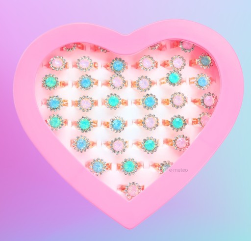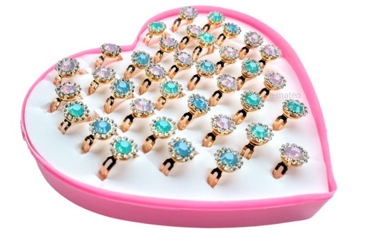 - 36 pierścionków z błyszczącymi elementami umieszczono w pudełeczku w kształcie serca.