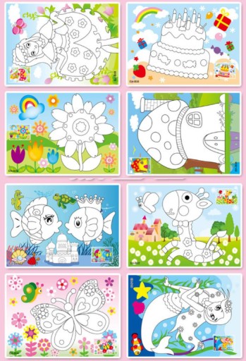 Po skończonej zabawie z kolorowymi diamencikami, dziecko może odwrócić obrazek. Na odwrocie każdego arkusza znajduje się kolorowanka, która dodatkowo angażuje dziecko, powodując jeszcze dłuższą zabawę.
