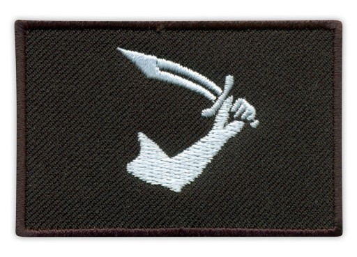 Naszywka na czarnym tle przedstawia umięśnioną rękę z szablą piracką, całość znaku w kolorze białym.
