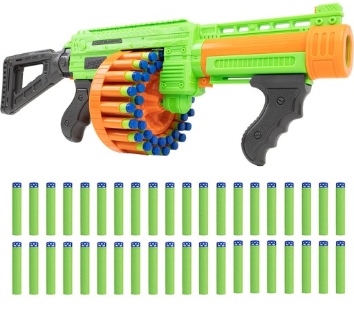 Odpowiedź na modlitwy fanów wyrzutni właśnie nadeszła - Villainator łączy w sobie wszystkie upragnione cechy idealnej wyrzutni: daleki zasięg na 25 metrów, zawrotną szybkość strzału, celność i niesamowicie pojemny magazynek! Specjalnie zaprojektowany Super-Magazynek pomieści 40 strzałek a wygodny uchwyt do przeładowania pozwala strzelać szybką serią i zasypać przeciwnika gradem strzałek! Dodatkowo wygodna kolba pozwala oprzeć wyrzutnie o ramię ustabilizować pozycję i zwiększyć celność wystrzału. Ponad to zestaw został wyposażony w ulepszone strzałki z waflowymi główkami które zostały specjalnie zaprojektowane z myślą o większej celności.