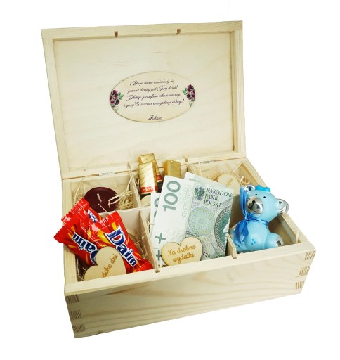 - w środku pudełka naklejona tabliczka z życzeniami (można podać własny tekst)