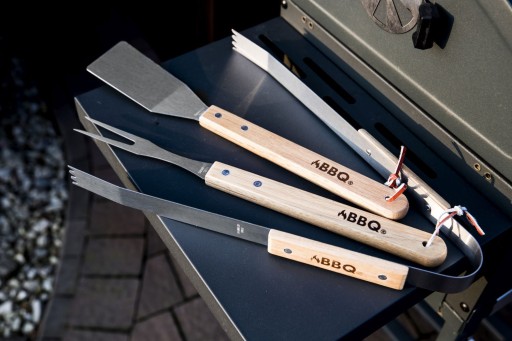 3-częściowy zestaw przyborów do grilla zawiera kleszcze, łyżkę do obracania i widelec ze stali chromowanej. Rączka jest z drewna. Zestaw zawiera podstawowe narzędzia niezbędne do grilla. Narzędzie jest wyposażone w uszko do zawieszenia.
