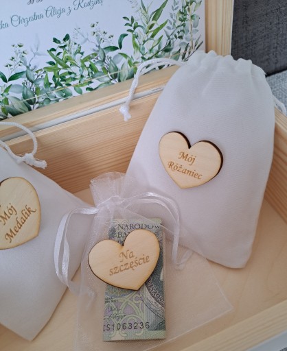 W środku pudełka znajdują się 3białe woreczki z wygrawerowanym napisem: