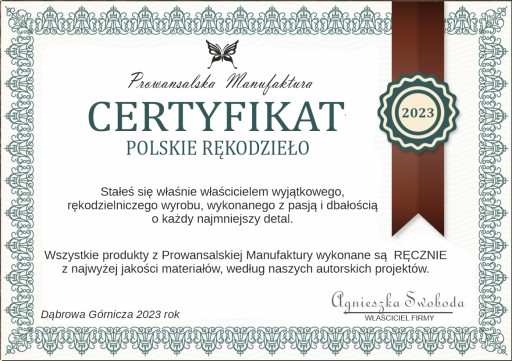 Do każdego pudełka dołączany jest certyfikat potwierdzający, że produkt ten został wykonany przez nas ręcznie, z najwyższej jakości materiałów, według naszych autorskich projektów.