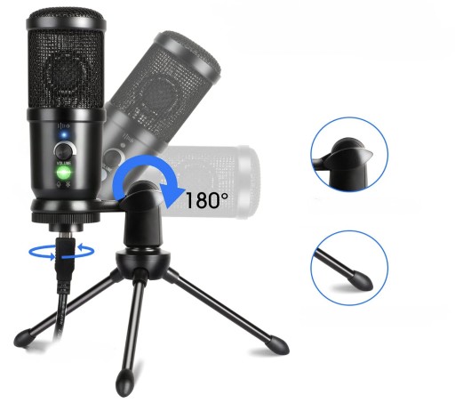 Mikrofon stojący ma metalowy uchwyt, który jest stabilny i mocny. Mikrofon pojemnościowy może być obracany o 180 stopni bez poruszania mikrofonem, można ustawić odpowiedni kąt, aby uzyskać najlepszy kierunek nagrywania.