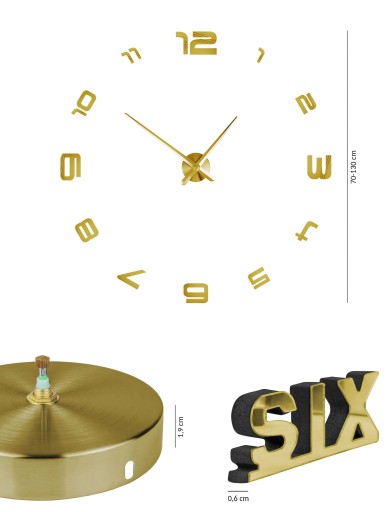 Zegar świetnie wpasuje się zarówno w nowoczesne, jak i klasyczne wnętrza. Zaopatrzony jest w mechanizm Tajwan Ruch Youngtown. Cyfry wykonane są z pianki samoprzylepnej EVA i akrylu z efektem lustra, a wskazówki z metalu. Zegar i wskazówki są złote (lustro). Wymiary zegara to 70 do 130 cm, a samej tarczy 10 cm. Zapakowany jest w sztywne pudełko. Montaż zegara jest szybki i wygodny. Każdy element dekoracyjny podklejony jest taśmą, która umożliwia montaż do ściany. Zegar posiada szablon, dzięki czemu w precyzyjny sposób rozmieścisz elementy.