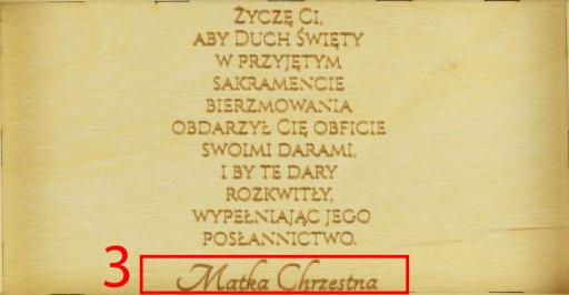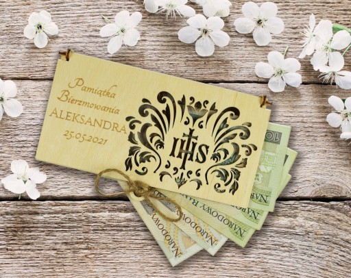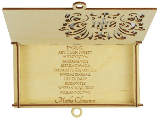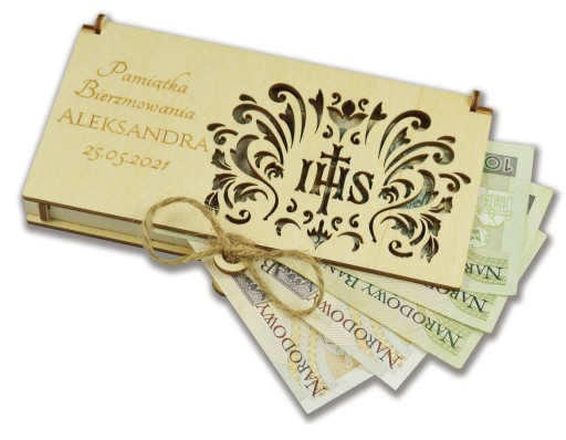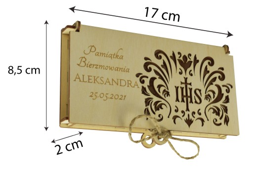 Drewniane, grawerowane pudełko na pieniądze z okazji bierzmowania.