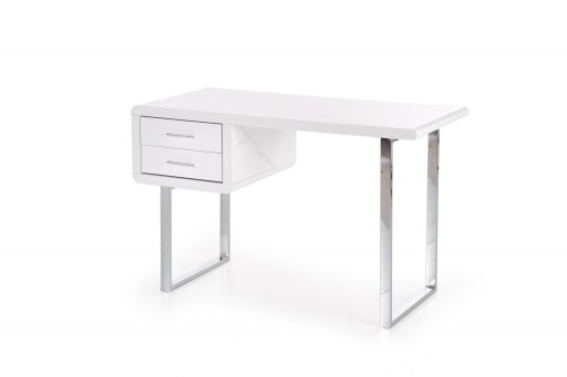 Eleganckie biurko w wysokim połysku. Zostało wykonane z lakierowanej płyty MDF w kolorze białym, stelaż natomiast ze stali chromowanej. Mebel jest bardzo praktyczny i funkcjonalny, po prawej stronie posiada dwie podręczne szuflady. Dzięki swojej uniwersalnej formie biurko pasuje zarówno do nowoczesnych jak i klasycznych wnętrz.