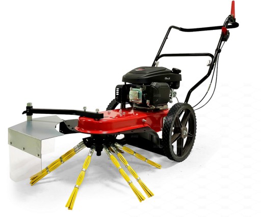 - Szczotki to połączenie prętów metalowych oraz z tworzywa sztucznego, co zapewnia bardzo wysoką jakość pracy. Duże, łożyskowane koła ułatwią manewrowanie odchwaszczarką. Osłona po lewej stronie szczotek ma za zadanie wyłapać zanieczyszczenia wylatujące spod urządzenia roboczego.