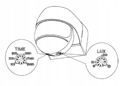 Potencjometrem czasu ustawiamy czas, po którym oświetlenie ma się wyłączyć od momentu wykrycia ostatniego ruchu przez czujnik. Aby zwiększyć czas zwłoki należy potencjometr czasu przekręcić zgodnie z ruchem wskazówek zegara. Maksymalna zwłoka czasowa wynosi około 15 minut. Aby zmniejszyć czas zwłoki należy potencjometr czasu przekręcić w kierunku przeciwnym do ruchu wskazówek zegara. Minimalna zwłoka czasowa wynosi około 10 sekund.