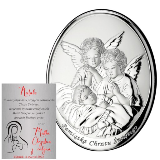 W jego produkcji wykorzystano innowacyjny metal szlachetny, który został pokryty warstwą czystego srebra o próbie 999,95. Drogocenny metal przewyższa jakością materiały pozyskiwane metodami tradycyjnymi. Jest odporniejszy na uszkodzenia mechaniczne i śniedzenie, doskonale odbija światło, co podkreśla szlachetność srebra. Całość została wyprodukowana we Włoszech, zgodnie tradycją obróbki metali szlachetnych. Do obrazka dołączona jest nóżka, aby móc go postawić oraz otwór do powieszenia. Jeżeli życzą sobie Państwo grawer, taką usługę również posiadamy w swojej ofercie - usługa GRATISOWA. Obrazek z dedykacją będzie cudowną pamiątką z okazji Chrztu Św.