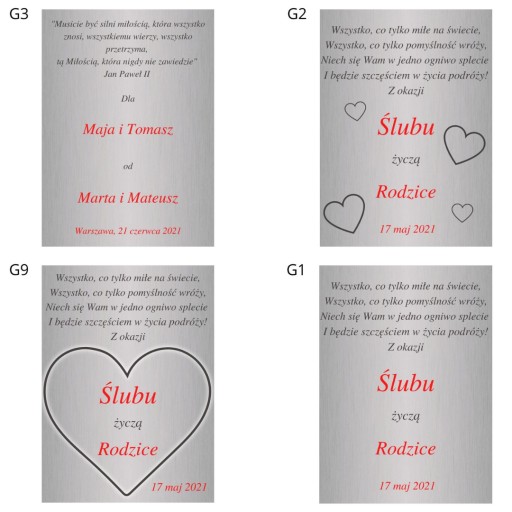 Zmiany w dedykacji dotyczą tekstu zaznaczonego kolorem czerwonym. W polu "Tekst graweru" należy umieść słowa zgodne z twoją dedykacją.