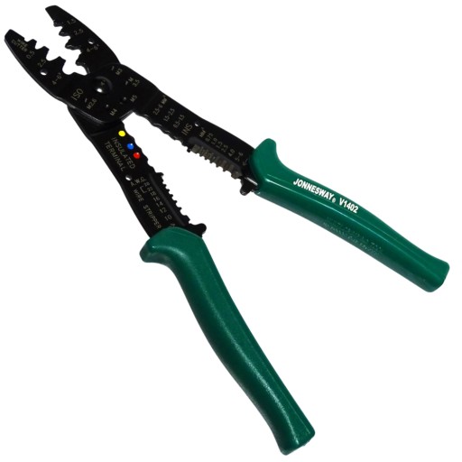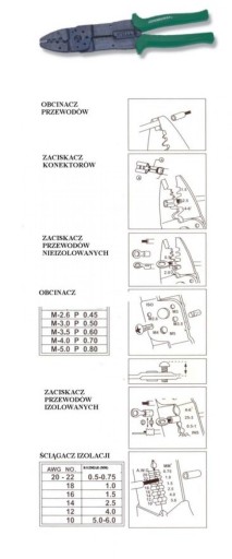 Wielofunkcyjne, uniwersalne szczypce do zaciskania końcówek konektorowych izolowanych, nieizolowanych, ściągania izolacji, obcinania śrub, wyposażone w ostrza do cięcia przewodów. Przeznaczone także do profesjonalnego zastosowania.