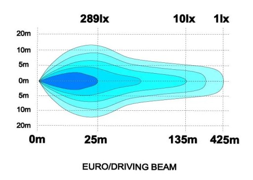 -8500 lumenów i 1 lux przy 450m oraz 0,25 lux przy 850m.