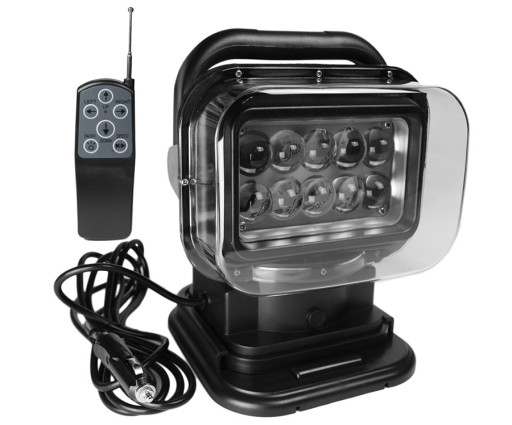 Wodoodporna lampa ledowa, ze zdalnym sterowaniem w promieniu 360st w poziomie i 120st w pionie. Posiada gumową magnetyczną stopę oraz dodatkową podstawę, umożliwiającą szybki montaż lub demontaż lampy, tam gdzie magnes nie trzyma. Zasilanie na gniazdo zapalniczki. Pilotem możemy również zwiększać prędkość przesuwu. Zasięg pilota to ok 100m.