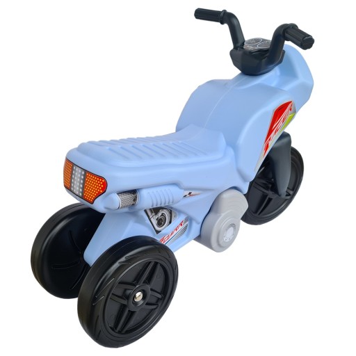 Motorek jest w kolorze Blue Light. Z tyłu znajdują się dwa koła, co daje dużą stabilność oraz kontrolę nad pojazdem. Jeździk wykonany jest z wysokiej jakości tworzywa, dzięki temu jest solidny, trwały i odporny na warunki atmosferyczne.