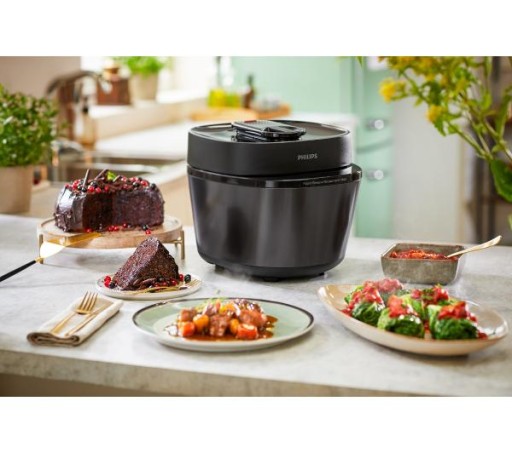 - Dodatkowe opcje: aplikacja mobilna z przepisami w języku polskim, blokada rodzicielska, gotowanie na parze, możliwość przechowywania w lodówce, opóźnienie startu, podgrzewanie, podtrzymywanie ciepła, sous-vide, stopy antypoślizgowe, sygnalizacja dźwiękowa, timer, uchylna pokrywa na zawiasie, wolne gotowanie