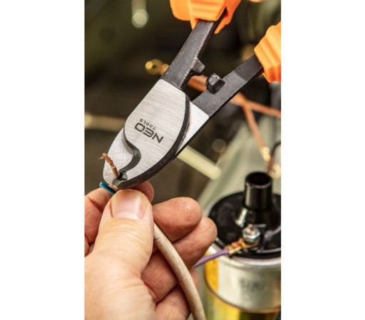 - Obcinak do kabli miedzianych i aluminiowych NEO (nr ref. 01-513) o wymiarze 160 mm, wykonany zgodnie z normą DIN 5749. Hartowane szczęki tną do maksymalnej średnicy 10 mm. Wysokogatunkowa stal chromowo-wanadowa zapewnia długoletnią wytrzymałość szczęk.