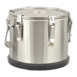 Termos nierdzewny o pojemności 10 litrów posiadający podwójne ścianki z izolacją oraz podwójna pokrywę z uszczelką silikonową i odpowietrznikiem. Termos posiada pokrywę zamykaną na 6 solidnych zatrzasków oraz wytrzymałe nienagrzewające się uchwyty. Dodatkowo termos posiada gumowaną podstawę zabezpieczającą przed ewentualnymi uszkodzeniami.