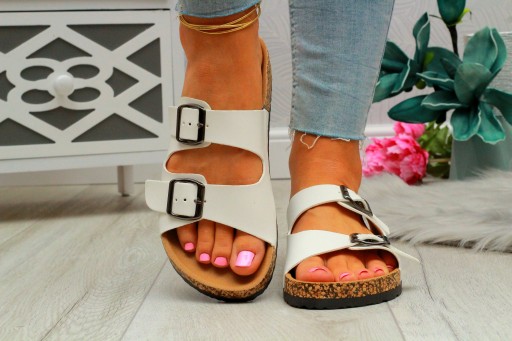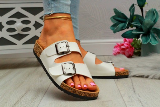 Damskie klapki casual na dwie klamry w kolorze białym. Sprawdzą się idealnie jako obuwie na co dzień. Będą odpowiednie na ciepłe, wiosenne i letnie, upalne dni. Pasują do wielu stylizacji. Płaska, korkowa podeszwa oraz profilowana wkładka zapewniają komfort i wygodę użytkowania.