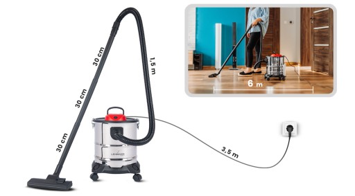 Zasięg pracy wynosi prawie 6 metrów! [wąż 1,5m + przewód 3,5m + rury ssące 3x30cm]