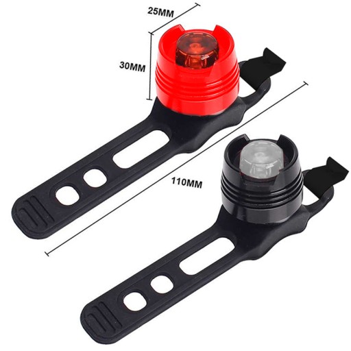 W zestawie znajdują się dwie lampki: przednia i tylna. Jedna z nich posiada diodę czerwoną, druga białą.