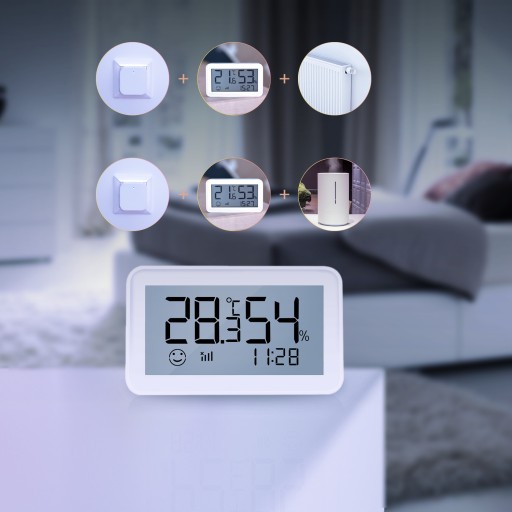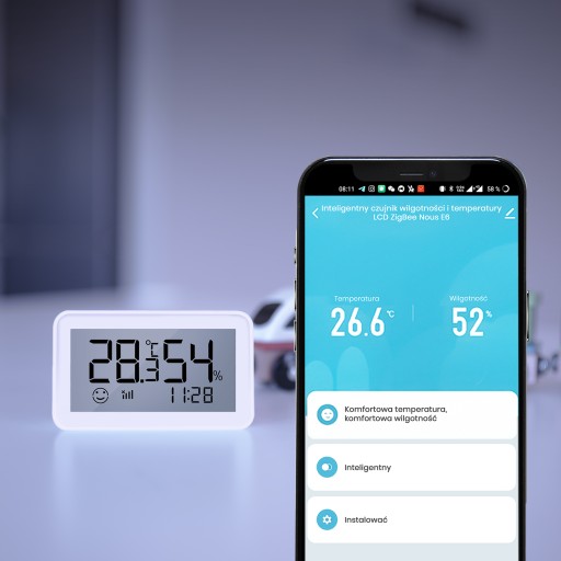 NOUS E6 to czujnik temperatury i wilgotności ZigBee z wyświetlaczem LCD zaprojektowany do monitorowania zmian temperatury i wilgotności w Twoim domu, a wszystkie odczyty mogą być sprawdzane w czasie rzeczywistym w aplikacji NOUS SMART HOME.