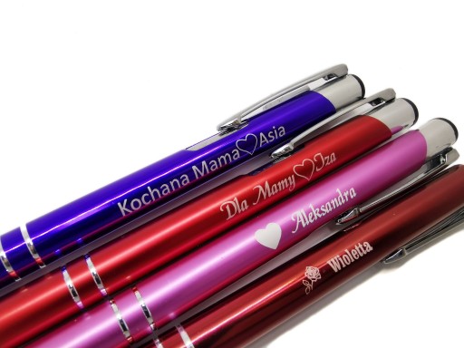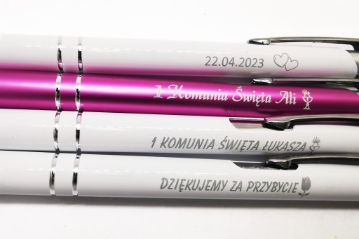 Na długopisach grawerujemy dowolny tekst, logo, grafikę na podstawie przesłanych nam danych na adres e-mail. Grawer jest trwały, wykonany przy użyciu lasera CO2. Na tej aukcji grawer na wszystkich długopisach jest taki sam. Wkład w długopisach jest niebieski.