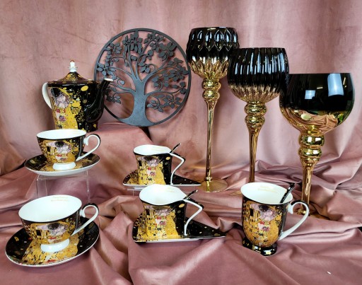 Kubek posiadający zdobienie przedstawiające obraz Gustawa Klimta- Pocałunek.