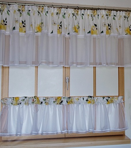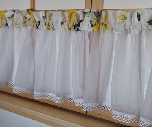 - LAMBREKIN szerokość około 220 cm, wysokość 60cm wykończony delikatną gipiurą.U góry doszyta taśma marszcząca z wypustka zakrywającą żabki karnisza