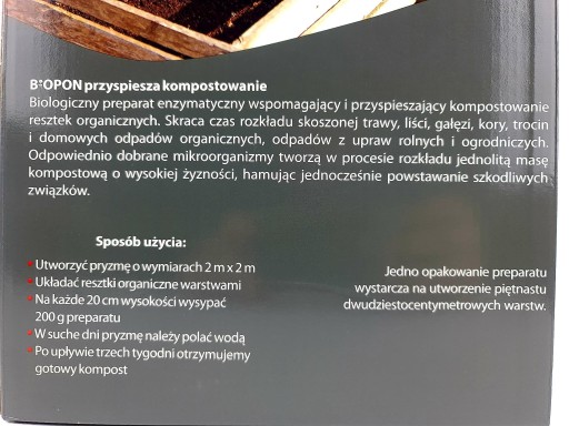 Preparat przeznaczony do przyspieszania rozkładu resztek organicznych pochodzących z gospodarstw rolnych, domowych czy ogródków działkowych. Zawartość odpowiednio dobranych mikroorganizmów i enzymów przyspiesza powstawanie kompostu, zapobiegając tym samym rozwojowi szkodliwych związków.
