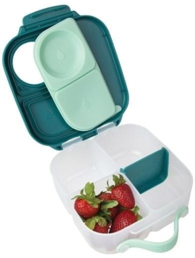 Mini lunchbox b.box dla dzieci ma dwie szczelne przegródki w tym jedną flex przeznaczoną na całe owoce. W przegrody te można włożyć także takie przekąski jak jogurt, humus, gęsty przecier, dip, soczyste owoce i warzywa. Obok znajduje się przegroda bez uszczelki z przesuwanym i wyjmowanym elementem dzielącym ułatwiającym dopasowanie do potrzeb. Lunchbox b.box ma kształt poręcznej walizeczki w wygodnym uchwytem i prostym w obsłudze zatrzaskiem.