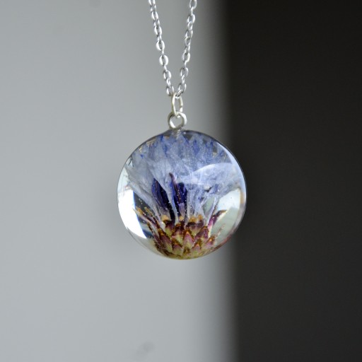 Wisiorek z żywicy epoksydowej w kształcie półkuli z chabrem na przezroczystym tle.