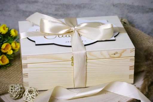 Ponadto pudełko dekorujemy elegancką beżową wstążką!