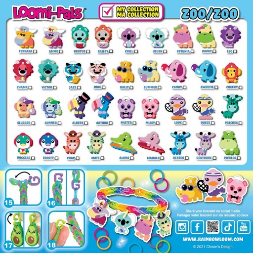 Lista uroków w instrukcji obsługi służy krosnom do śledzenia uroków, które zebrali i jeszcze nie zebrali. Celem naszej firmy przy tworzeniu tego produktu jest promowanie większej interakcji społecznej między dziećmi i ich przyjaciółmi w naszym rozwijającym się świecie technologii, co może być ułatwione przez handel zawieszkami Loomi-Pal w celu zebrania ich wszystkich.