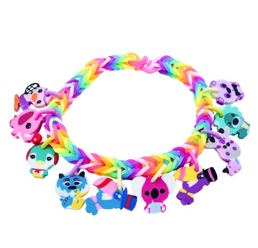 Użyj kolorowych gumek i rozmaitych zawieszek z zestawu, aby stworzyć oryginalne bransoletki.