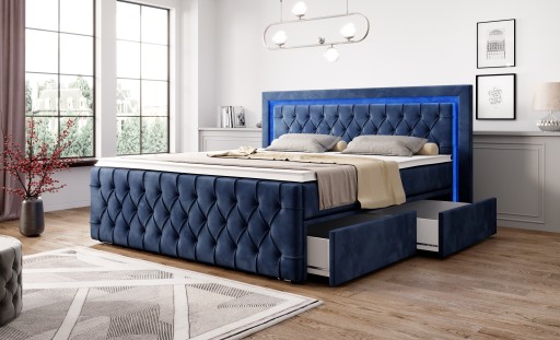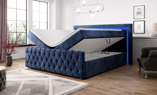 Kompletne łóżko kontynentlane AROSA z materacami na 9-strefowej sprężynie kieszeniowej. Zagłowie łóżka z oświetleniem LED oraz ozdobnym pikowaniem Chesterfield.