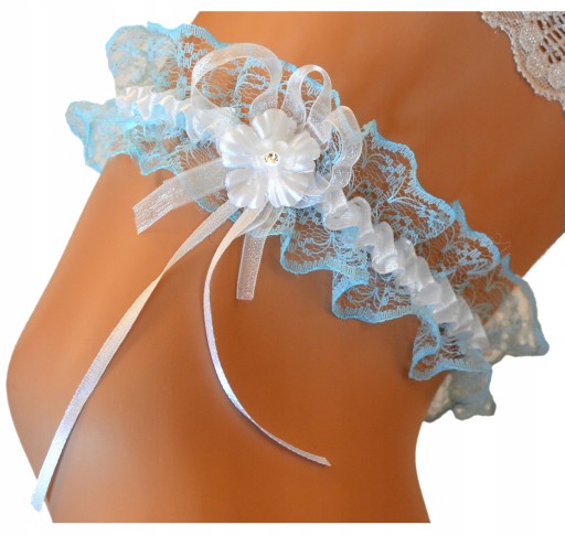 Fantastyczna biało-niebieska podwiązka ślubna z koronki, ozdobiona śliczną cyrkonią.