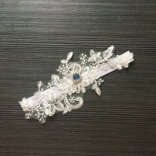Fantastyczna biała podwiązka ślubna z koronki, ozdobiona dużą niebieską cyrkonią.