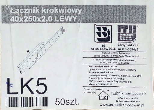 Łącznik ciesielski krokwiowy lewe ŁK5 40x250x 2,0 mm (1 szt.)