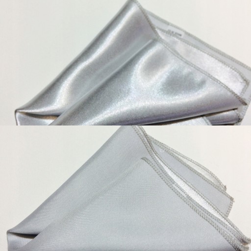 Poszetka po jednej stronie jest matowa, a po drugiej błyszcząca. Brzegi poszetki zostały starannie obszyte. Można ją złożyć w dowolny sposób.