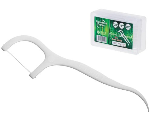 Na jednym z końców umieszczona jest nitka dentystyczna, na drugim znajduje się wykałaczka.
