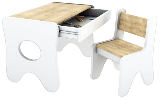 Stolik i krzesełko dla dziecka – oryginalny styl w dziecięcym wnętrzu. Meble dla dzieci zaprojektowane z myślą o bezpieczeństwie, wygodzie i prawidłowym rozwoju najmłodszych. Odpowiednio dobrane krzesełko ze stolikiem to świetny sposób na wykreowanie miejsca, które stanie się bezpieczną przestrzenią dla dzieci. Stolik i krzesełko dla dziecka to fundament zabawy, który uwolni wyobraźnię, tworząc idealne warunki do rozwoju każdego małego artysty. Mebelki wykonane są z certyfikowanych materiałów, wysokiej jakości płyty meblowej laminowanej, wszystkie narożniki są zaokrąglone by użytkowanie mebelków było bezpieczne dla naszych pociech, zaletą jest nowoczesna i bardzo stabilna konstrukcja oraz szuflada pod stolikiem gdzie dziecko może w każdej chwili coś schować albo coś wyjąć by móc bez ograniczeń kreować swoją zabawę.W zależności od potrzeb, stół sprawdzi się do nauki, malowania, zabawy czy spożywania posiłków.